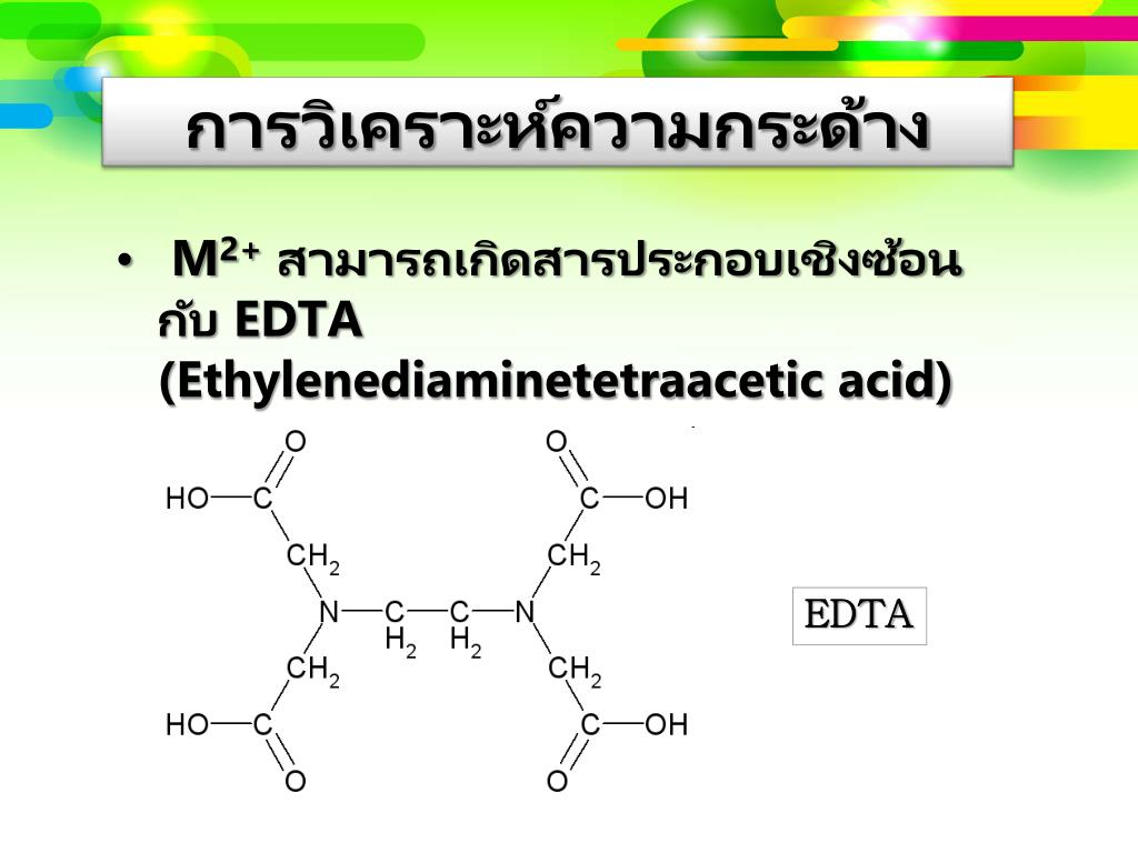 การวิเคราะห์ความกระด้างการวิเคราะห์ความกระด้าง • M2+สามารถเกิดสารประกอบเชิงซ้อนกับ EDTA (Ethylenediaminetetraacetic acid) EDTA