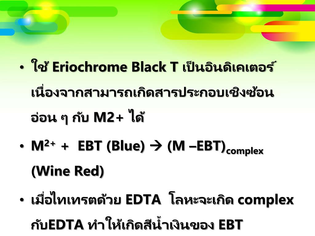 ใช้Eriochrome Black T เป็นอินดิเคเตอร์ เนื่องจากสามารถเกิดสารประกอบเชิงซ้อนอ่อน ๆ กับ M2+ ได้ • M2+ + EBT (Blue) (M –EBT)complex (Wine Red) • เมื่อไทเทรตด้วย EDTA โลหะจะเกิด complex กับEDTA ทำให้เกิดสีน้ำเงินของ EBT