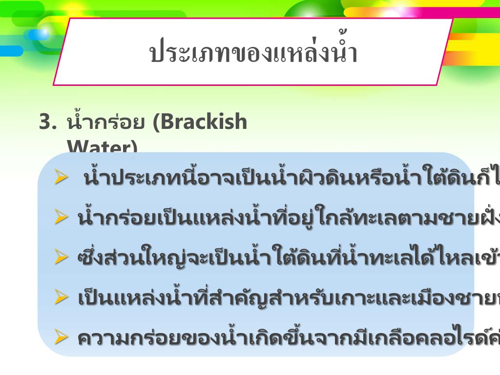 ประเภทของแหล่งน้ำ • น้ำกร่อย (Brackish Water) • น้ำประเภทนี้อาจเป็นน้ำผิวดินหรือน้ำใต้ดินก็ได้ • น้ำกร่อยเป็นแหล่งน้ำที่อยู่ใกล้ทะเลตามชายฝั่งและตามเกาะต่าง ๆ • ซึ่งส่วนใหญ่จะเป็นน้ำใต้ดินที่น้ำทะเลได้ไหลเข้ามาผสมกับน้ำจืดใต้ดิน • เป็นแหล่งน้ำที่สำคัญสำหรับเกาะและเมืองชายทะเล • ความกร่อยของน้ำเกิดขึ้นจากมีเกลือคลอไรด์ค่อนข้างสูง