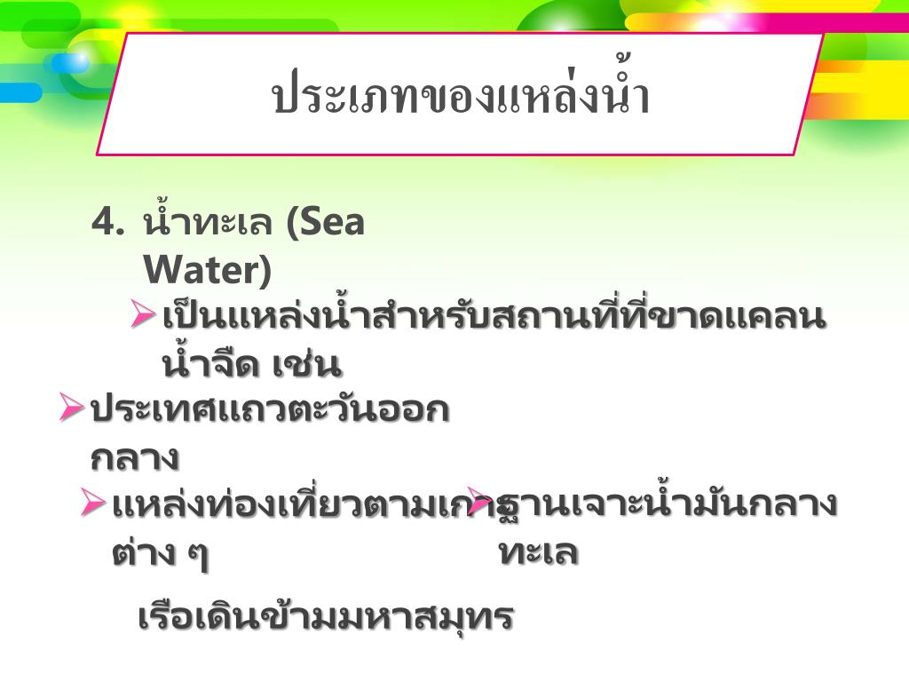 ประเภทของแหล่งน้ำ • น้ำทะเล (Sea Water) • เป็นแหล่งน้ำสำหรับสถานที่ที่ขาดแคลนน้ำจืด เช่น • ประเทศแถวตะวันออกกลาง • ฐานเจาะน้ำมันกลางทะเล • แหล่งท่องเที่ยวตามเกาะต่าง ๆ เรือเดินข้ามมหาสมุทร