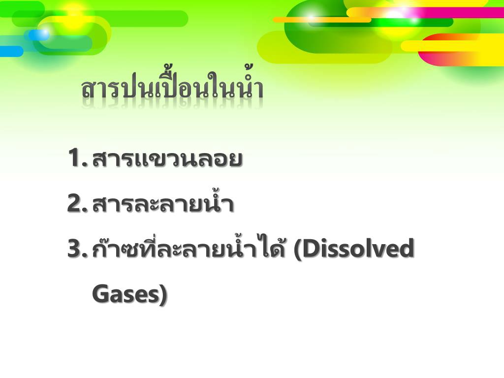 สารแขวนลอย สารละลายน้ำ ก๊าซที่ละลายน้ำได้ (Dissolved Gases) สารปนเปื้อนในน้ำ