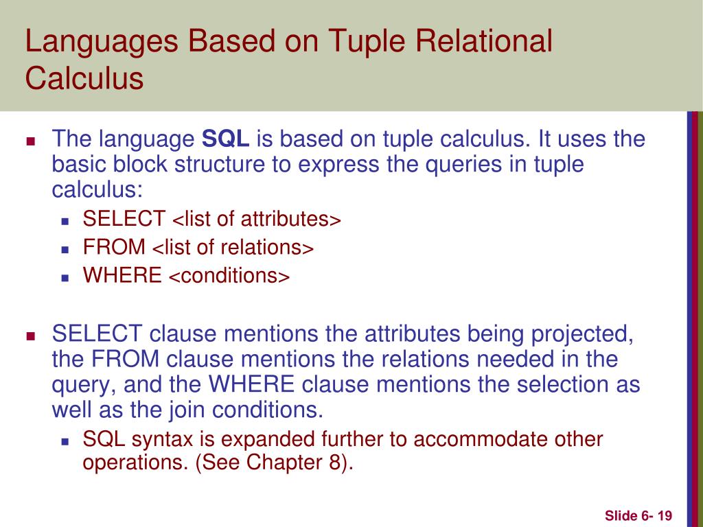 Languages Based on Tuple Relational Calculus • The language SQL is based on tuple calculus. It uses the basic block structure to express the queries in tuple calculus: • SELECT <list of attributes> • FROM <list of relations> • WHERE <conditions> • SELECT clause mentions the attributes being projected, the FROM clause mentions the relations needed in the query, and the WHERE clause mentions the selection as well as the join conditions. • SQL syntax is expanded further to accommodate other operations. (See Chapter 8).