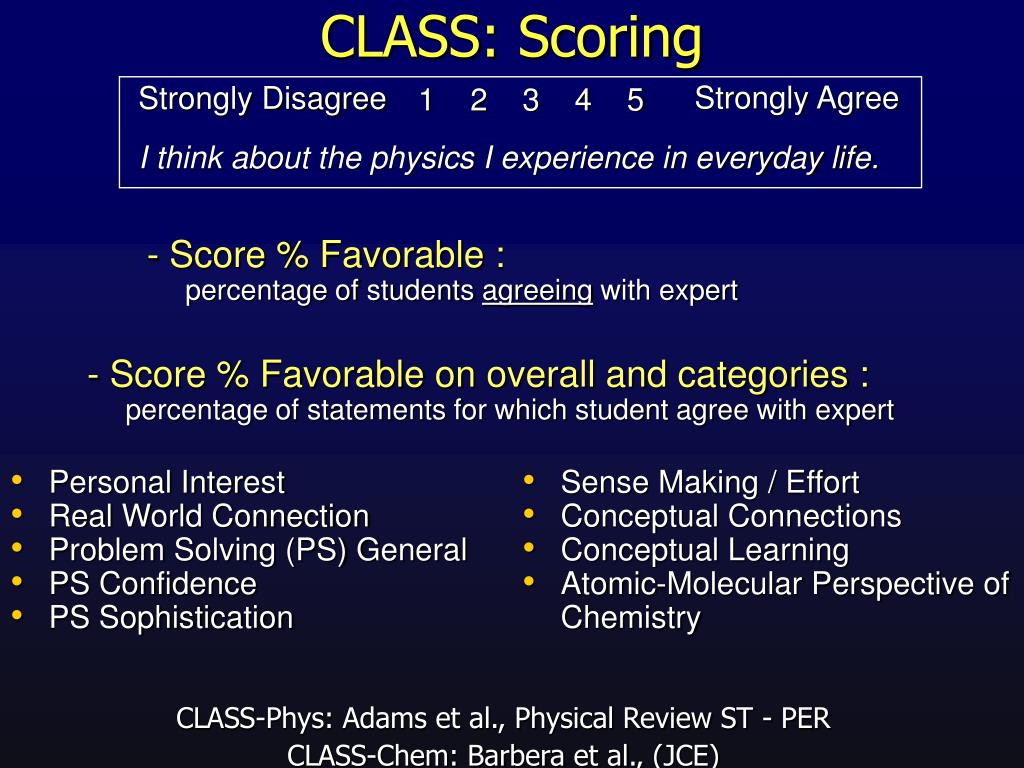 CLASS: Scoring Strongly Agree Strongly Disagree 1 2 3 4 5 I think about the physics I experience in everyday life. - Score % Favorable :percentage of students agreeing with expert - Score % Favorable on overall and categories :percentage of statements for which student agree with expert Personal Interest Real World Connection Problem Solving (PS) General PS Confidence PS Sophistication Sense Making / Effort Conceptual Connections Conceptual Learning Atomic-Molecular Perspective of Chemistry CLASS-Phys: Adams et al., Physical Review ST - PER CLASS-Chem: Barbera et al., (JCE)