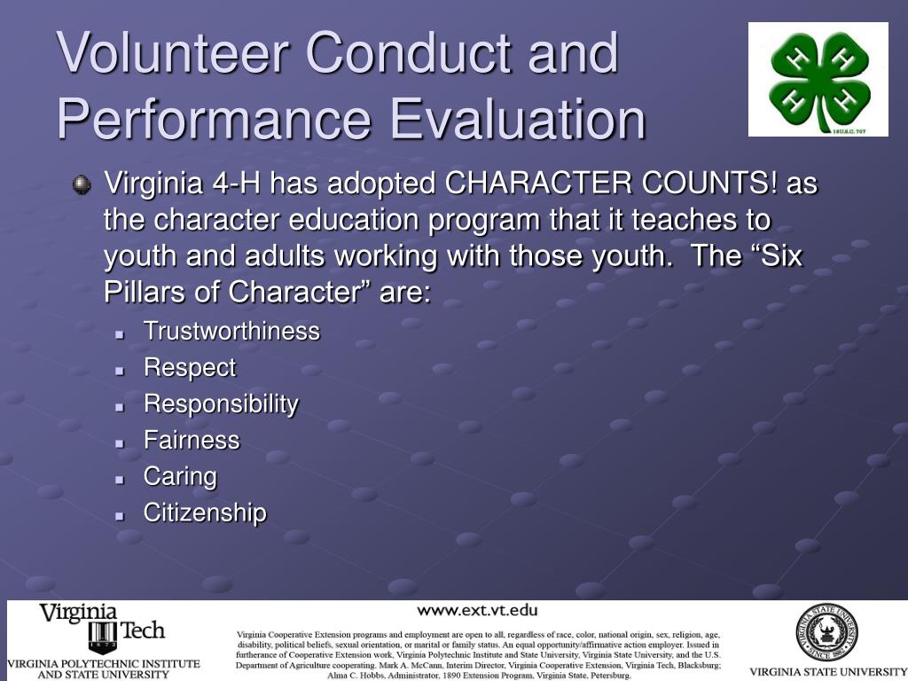 Volunteer Conduct and Performance Evaluation • Virginia 4-H has adopted CHARACTER COUNTS! as the character education program that it teaches to youth and adults working with those youth. The “Six Pillars of Character” are: • Trustworthiness • Respect • Responsibility • Fairness • Caring • Citizenship