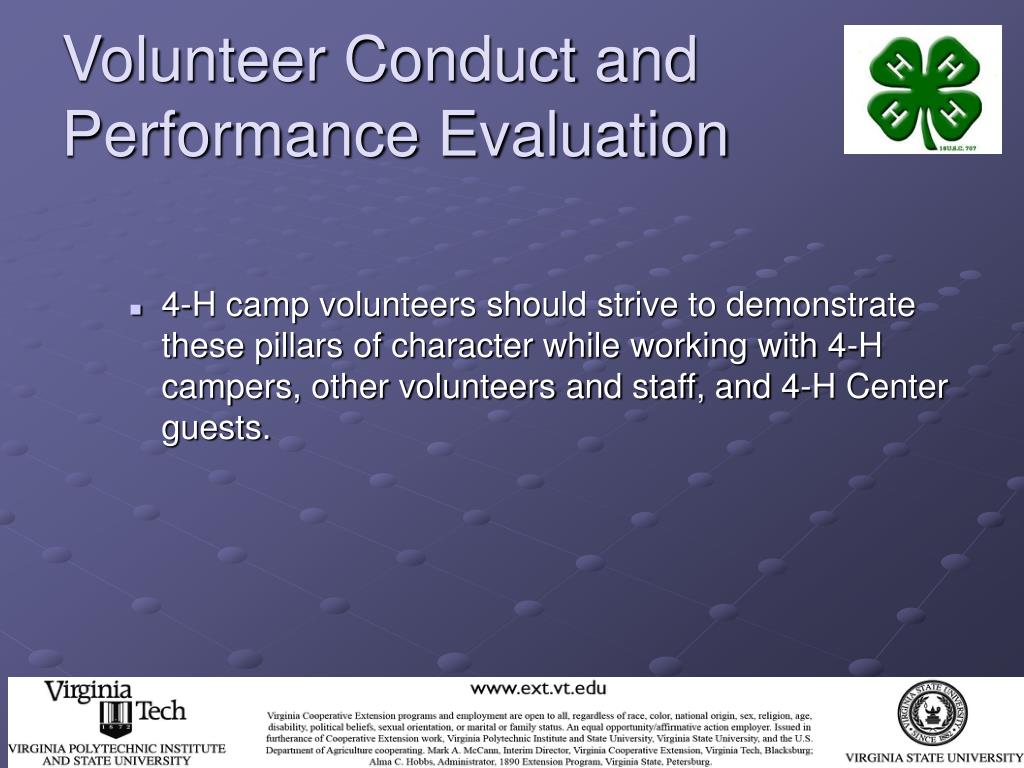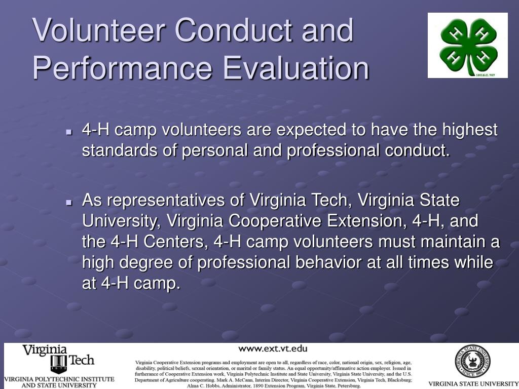 Volunteer Conduct and Performance Evaluation • 4-H camp volunteers are expected to have the highest standards of personal and professional conduct. • As representatives of Virginia Tech, Virginia State University, Virginia Cooperative Extension, 4-H, and the 4-H Centers, 4-H camp volunteers must maintain a high degree of professional behavior at all times while at 4-H camp.