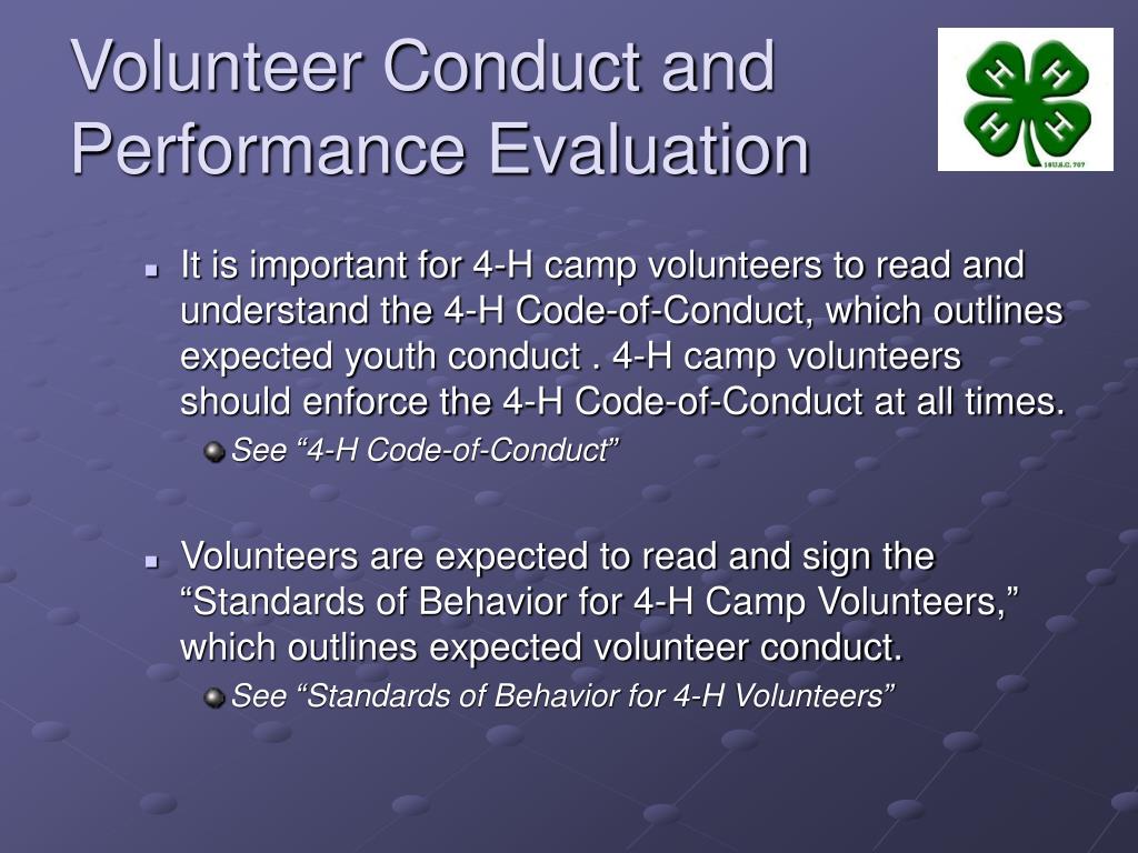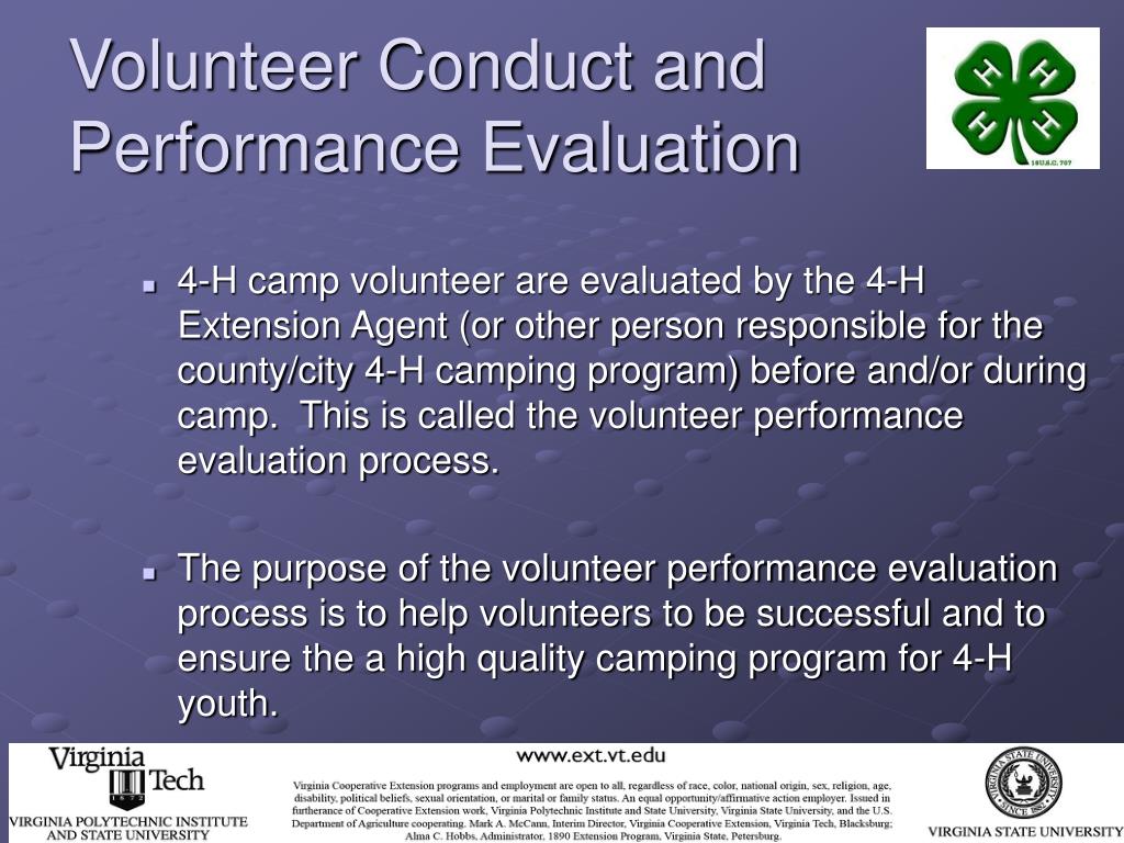 Volunteer Conduct and Performance Evaluation • 4-H camp volunteer are evaluated by the 4-H Extension Agent (or other person responsible for the county/city 4-H camping program) before and/or during camp. This is called the volunteer performance evaluation process. • The purpose of the volunteer performance evaluation process is to help volunteers to be successful and to ensure the a high quality camping program for 4-H youth.