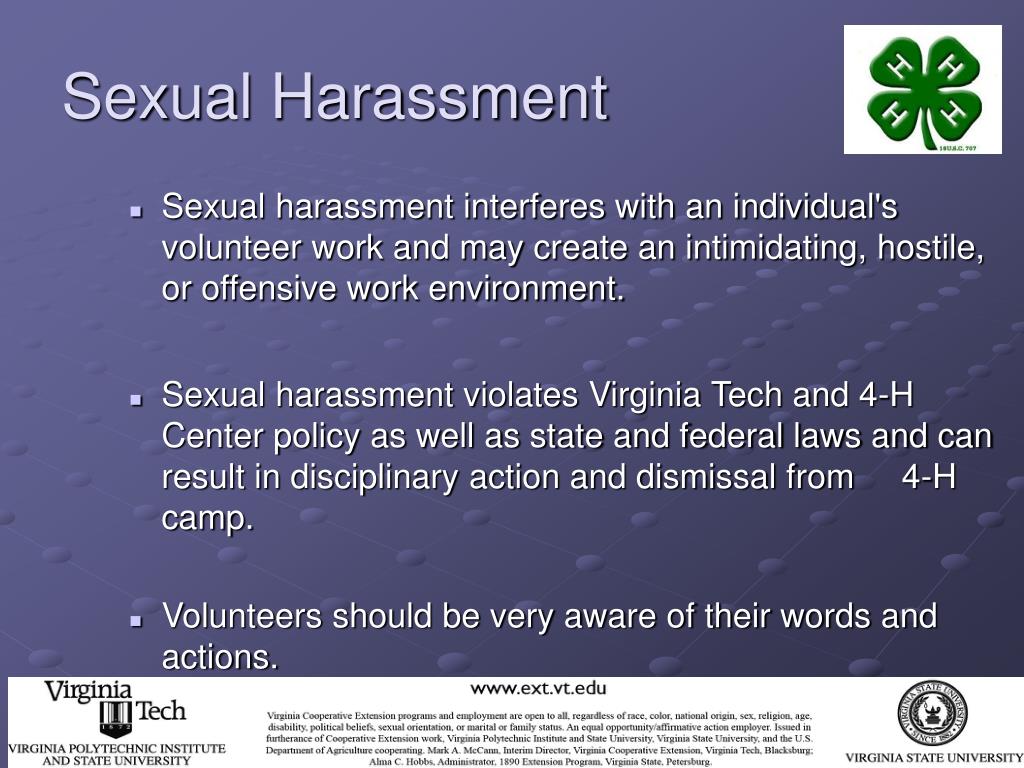 Sexual Harassment • Sexual harassment interferes with an individual's volunteer work and may create an intimidating, hostile, or offensive work environment. • Sexual harassment violates Virginia Tech and 4-H Center policy as well as state and federal laws and can result in disciplinary action and dismissal from 4-H camp. • Volunteers should be very aware of their words and actions.