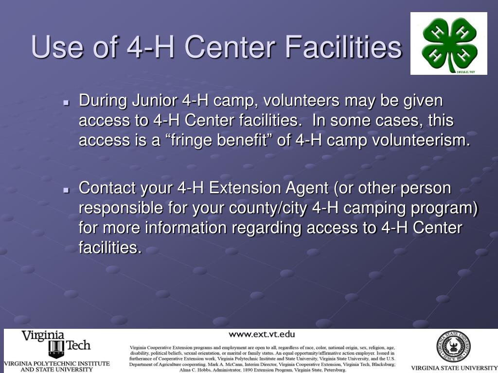 Use of 4-H Center Facilities • During Junior 4-H camp, volunteers may be given access to 4-H Center facilities. In some cases, this access is a “fringe benefit” of 4-H camp volunteerism. • Contact your 4-H Extension Agent (or other person responsible for your county/city 4-H camping program) for more information regarding access to 4-H Center facilities.