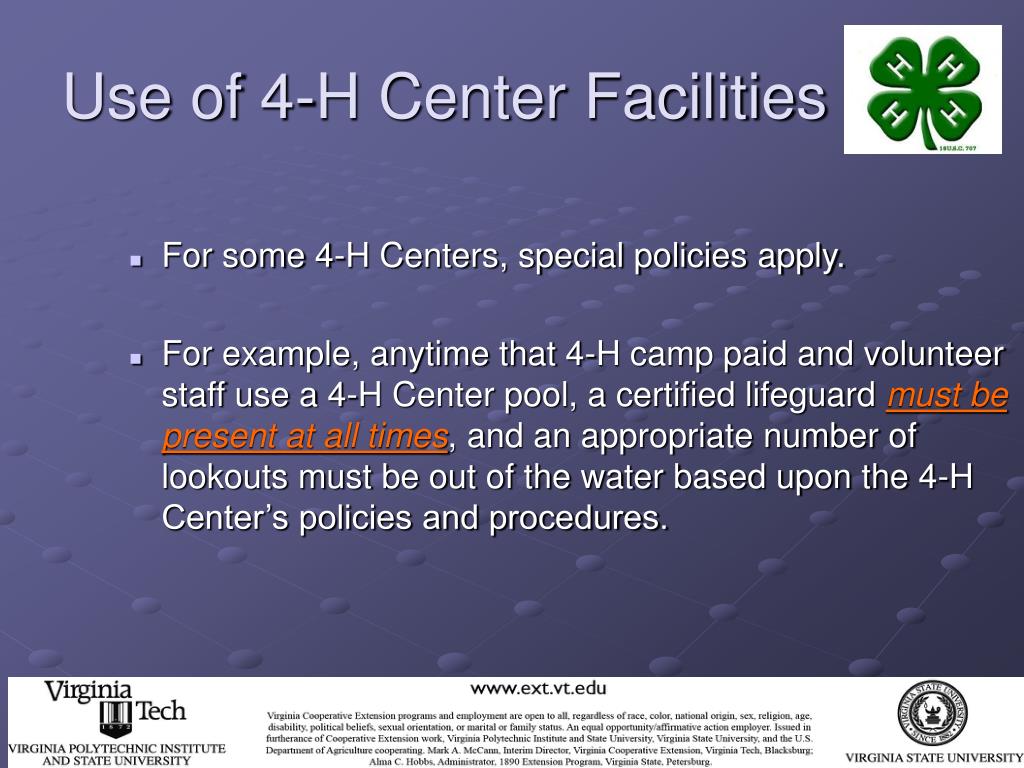 Use of 4-H Center Facilities • For some 4-H Centers, special policies apply. • For example, anytime that 4-H camp paid and volunteer staff use a 4-H Center pool, a certified lifeguard must be present at all times, and an appropriate number of lookouts must be out of the water based upon the 4-H Center’s policies and procedures.