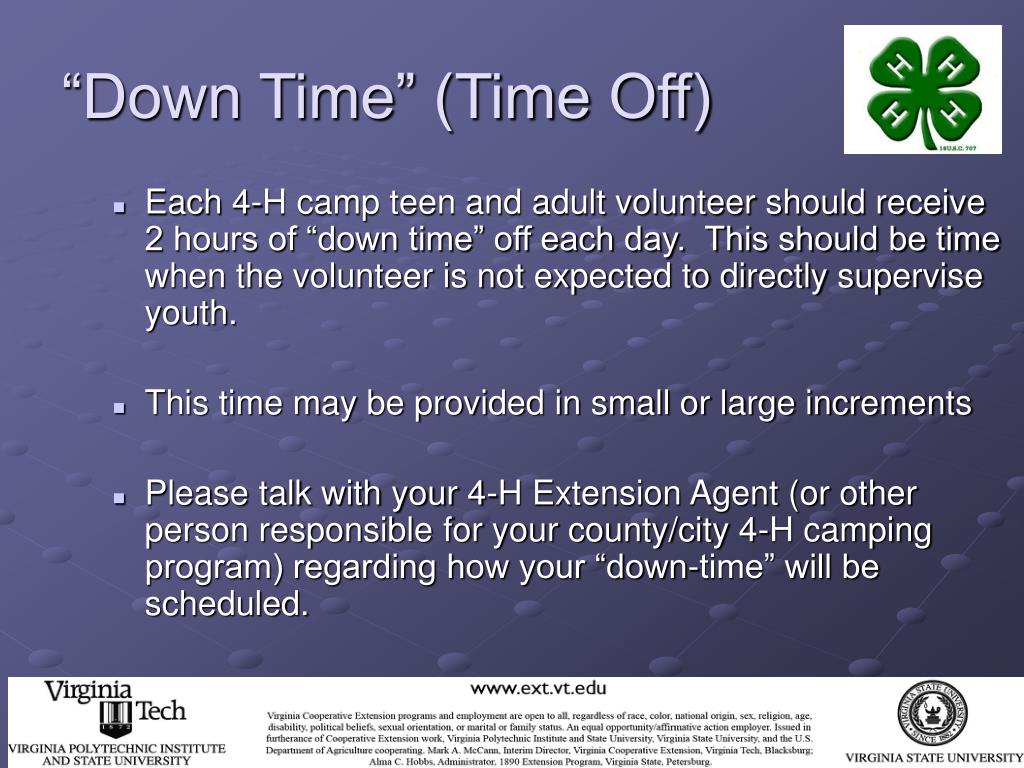 “Down Time” (Time Off) • Each 4-H camp teen and adult volunteer should receive 2 hours of “down time” off each day. This should be time when the volunteer is not expected to directly supervise youth. • This time may be provided in small or large increments • Please talk with your 4-H Extension Agent (or other person responsible for your county/city 4-H camping program) regarding how your “down-time” will be scheduled.