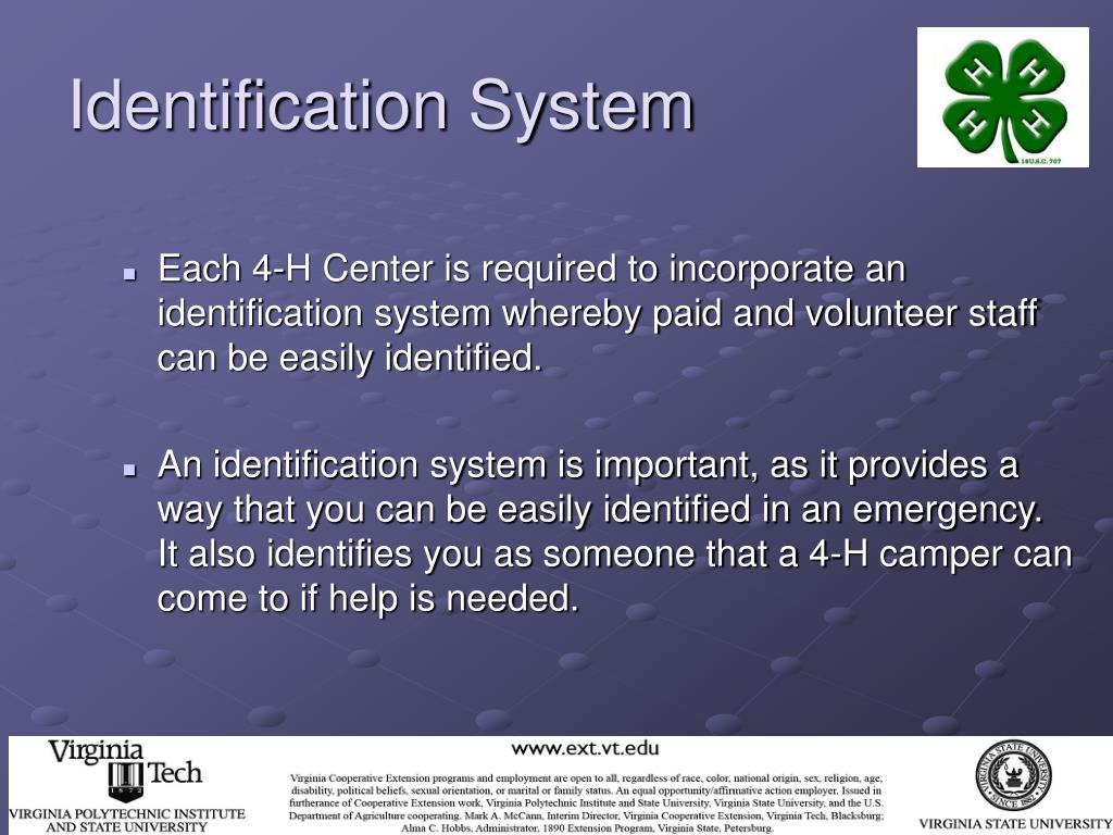 Identification System • Each 4-H Center is required to incorporate an identification system whereby paid and volunteer staff can be easily identified. • An identification system is important, as it provides a way that you can be easily identified in an emergency. It also identifies you as someone that a 4-H camper can come to if help is needed.