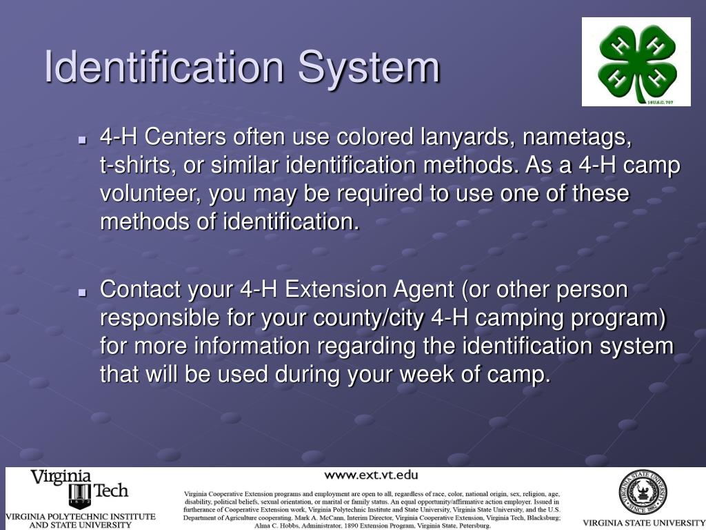 Identification System • 4-H Centers often use colored lanyards, nametags, t-shirts, or similar identification methods. As a 4-H camp volunteer, you may be required to use one of these methods of identification. • Contact your 4-H Extension Agent (or other person responsible for your county/city 4-H camping program) for more information regarding the identification system that will be used during your week of camp.