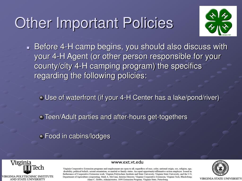Other Important Policies • Before 4-H camp begins, you should also discuss with your 4-H Agent (or other person responsible for your county/city 4-H camping program) the specifics regarding the following policies: • Use of waterfront (if your 4-H Center has a lake/pond/river) • Teen/Adult parties and after-hours get-togethers • Food in cabins/lodges