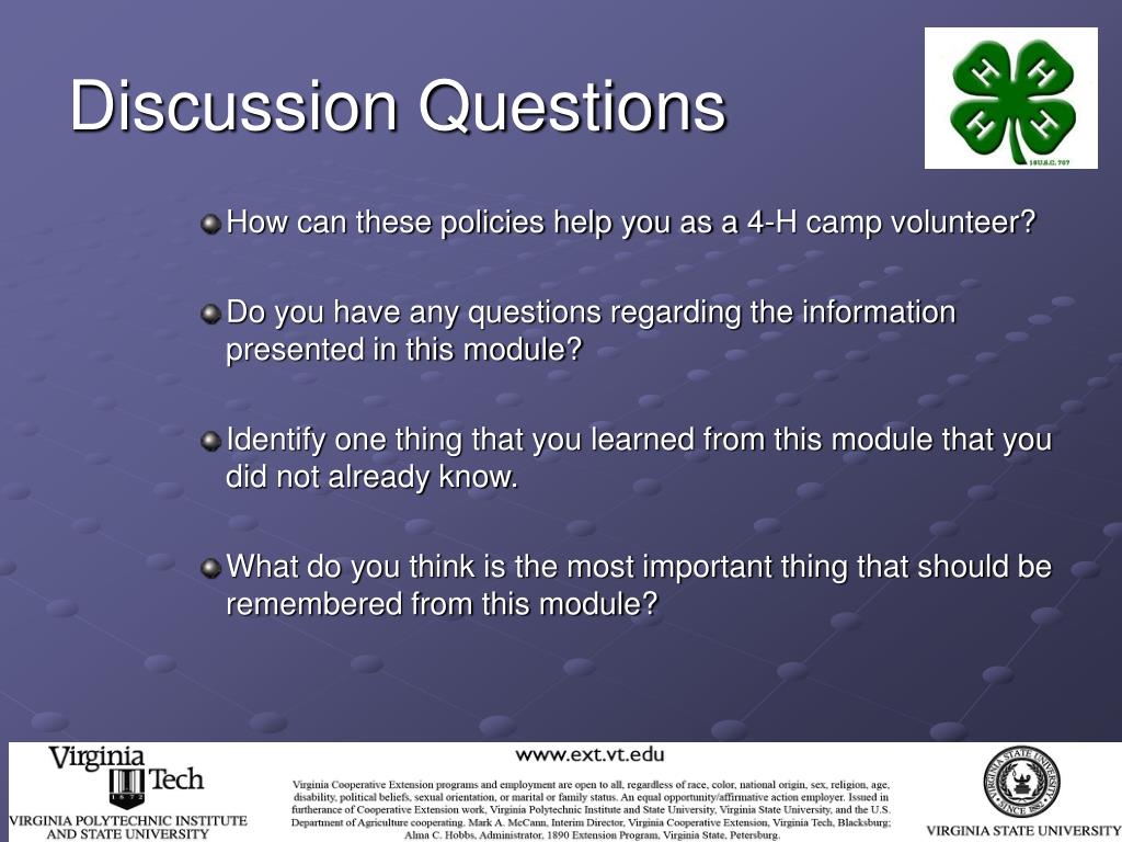 Discussion Questions • How can these policies help you as a 4-H camp volunteer? • Do you have any questions regarding the information presented in this module? • Identify one thing that you learned from this module that you did not already know. • What do you think is the most important thing that should be remembered from this module?