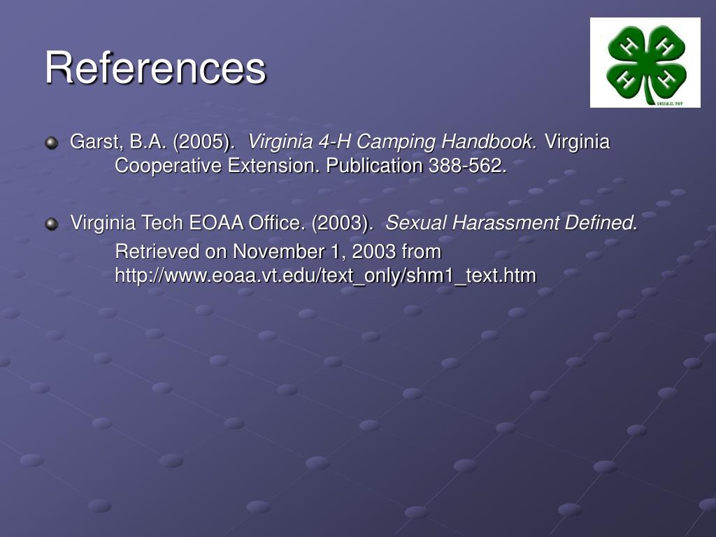 References • Garst, B.A. (2005). Virginia 4-H Camping Handbook. Virginia Cooperative Extension. Publication 388-562. • Virginia Tech EOAA Office. (2003). Sexual Harassment Defined. Retrieved on November 1, 2003 from http://www.eoaa.vt.edu/text_only/shm1_text.htm
