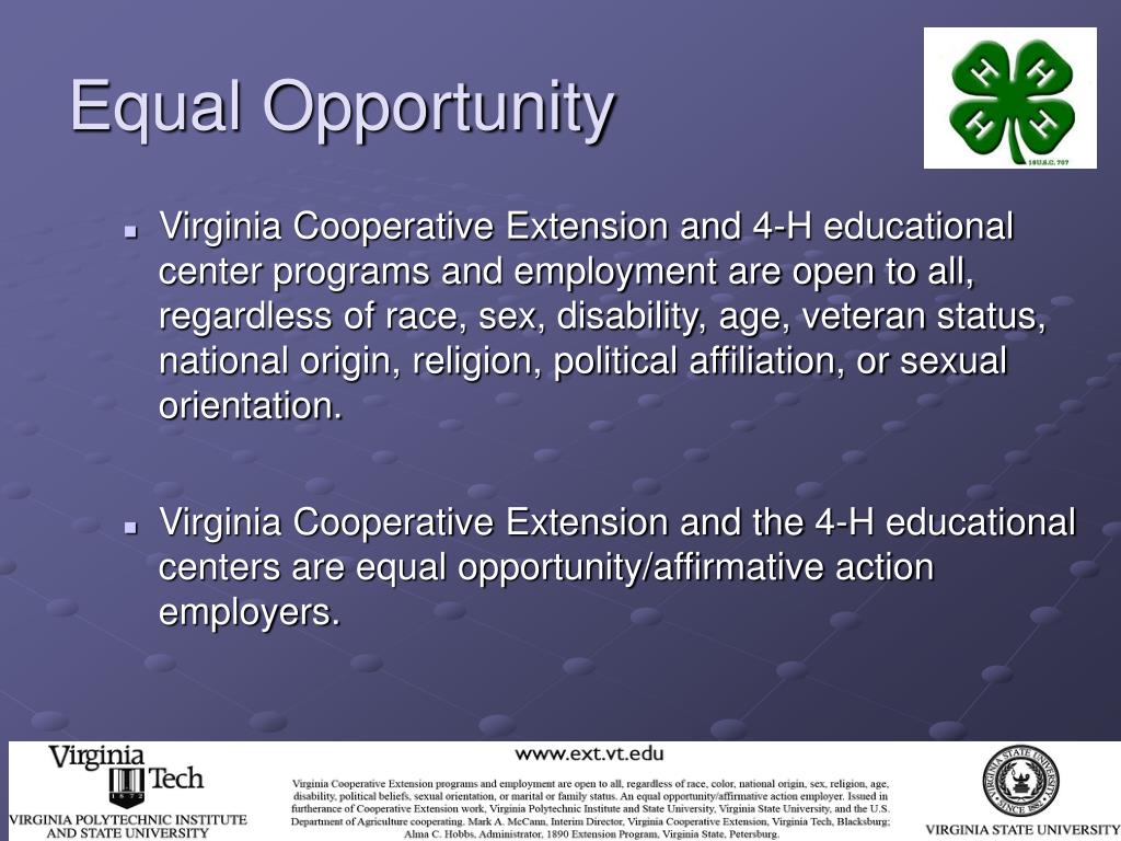 Equal Opportunity • Virginia Cooperative Extension and 4-H educational center programs and employment are open to all, regardless of race, sex, disability, age, veteran status, national origin, religion, political affiliation, or sexual orientation. • Virginia Cooperative Extension and the 4-H educational centers are equal opportunity/affirmative action employers.