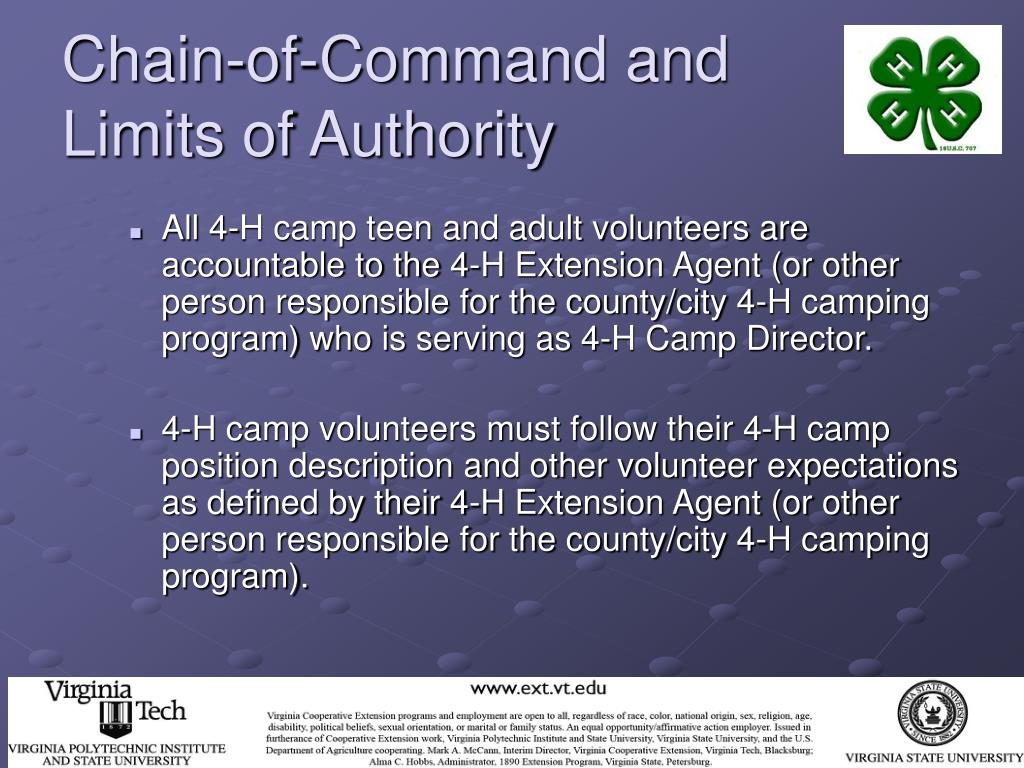Chain-of-Command and Limits of Authority • All 4-H camp teen and adult volunteers are accountable to the 4-H Extension Agent (or other person responsible for the county/city 4-H camping program) who is serving as 4-H Camp Director. • 4-H camp volunteers must follow their 4-H camp position description and other volunteer expectations as defined by their 4-H Extension Agent (or other person responsible for the county/city 4-H camping program).