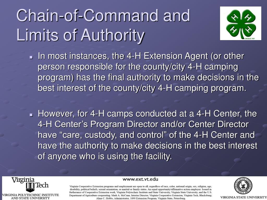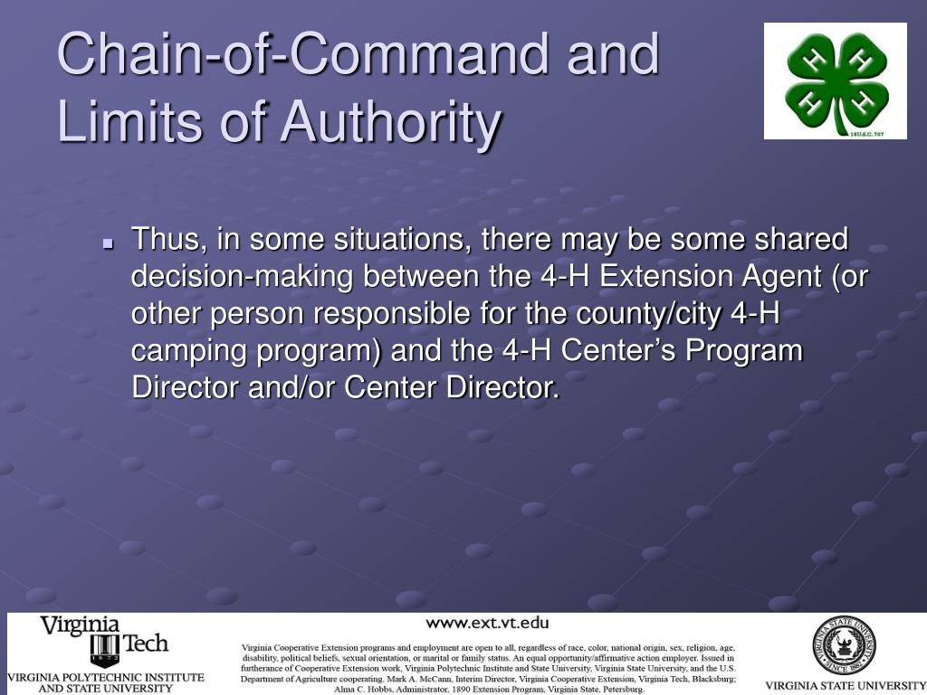 Chain-of-Command and Limits of Authority • Thus, in some situations, there may be some shared decision-making between the 4-H Extension Agent (or other person responsible for the county/city 4-H camping program) and the 4-H Center’s Program Director and/or Center Director.