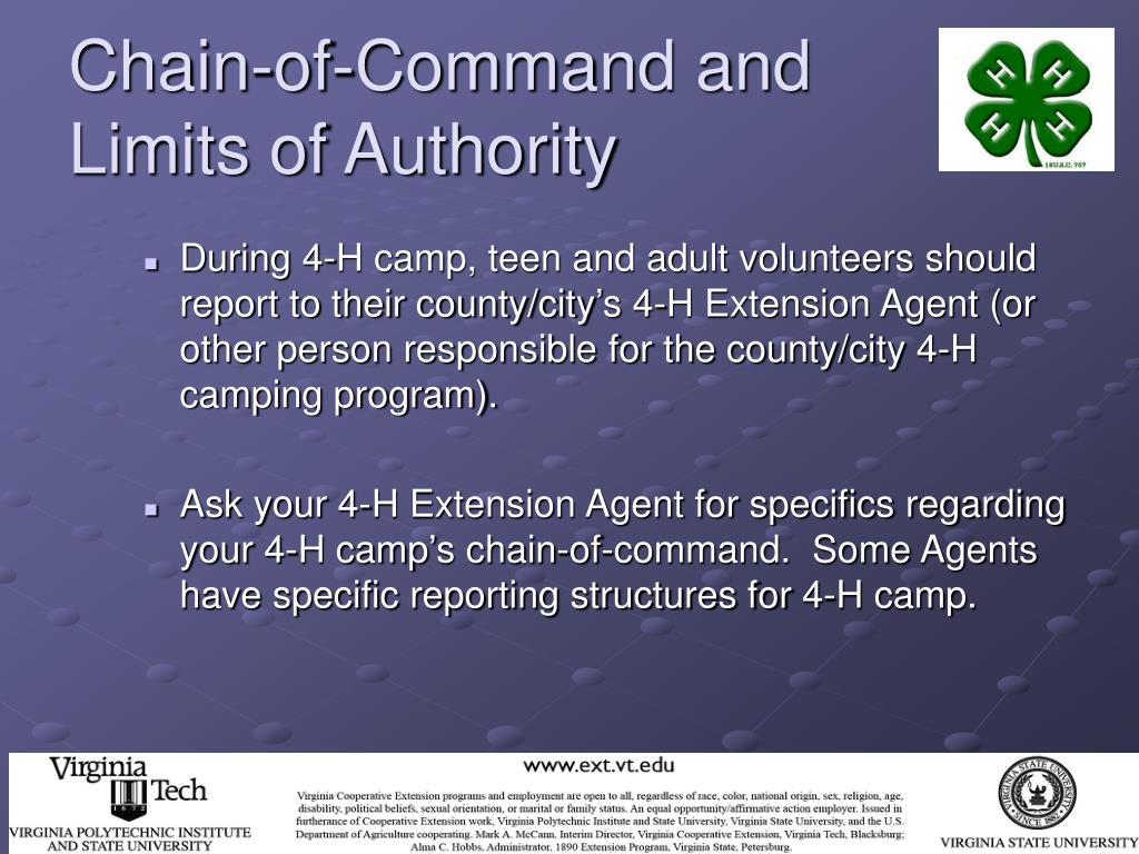 Chain-of-Command and Limits of Authority • During 4-H camp, teen and adult volunteers should report to their county/city’s 4-H Extension Agent (or other person responsible for the county/city 4-H camping program). • Ask your 4-H Extension Agent for specifics regarding your 4-H camp’s chain-of-command. Some Agents have specific reporting structures for 4-H camp.