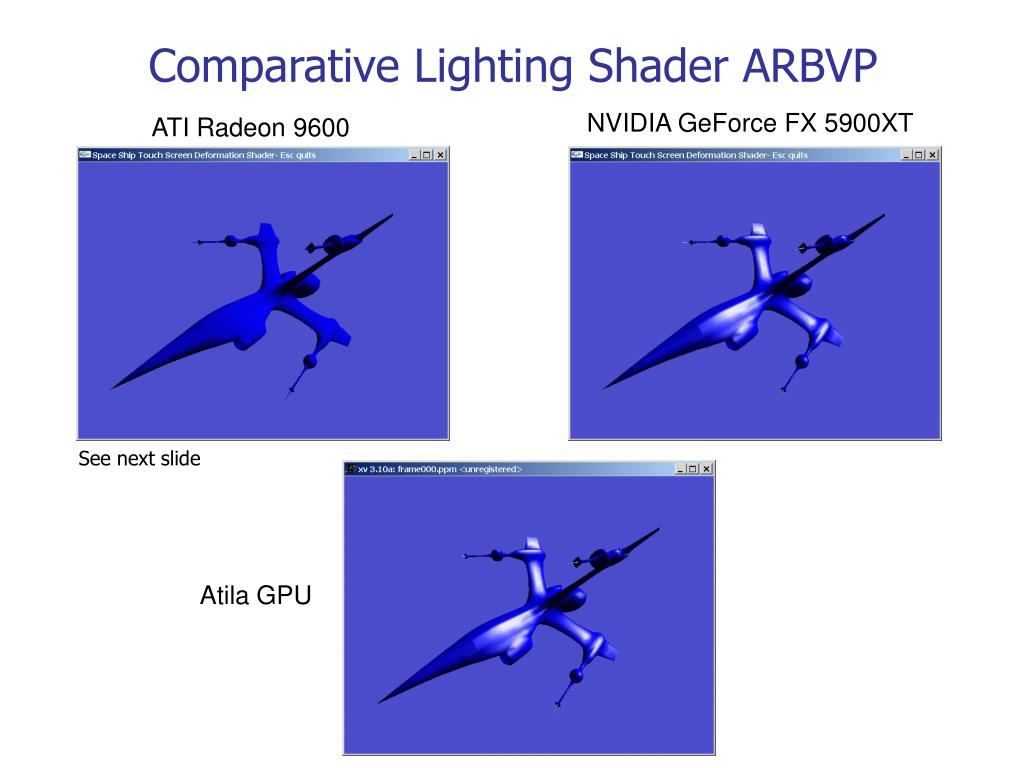 Comparative Lighting Shader ARBVP NVIDIA GeForce FX 5900XT ATI Radeon 9600 See next slide Atila GPU