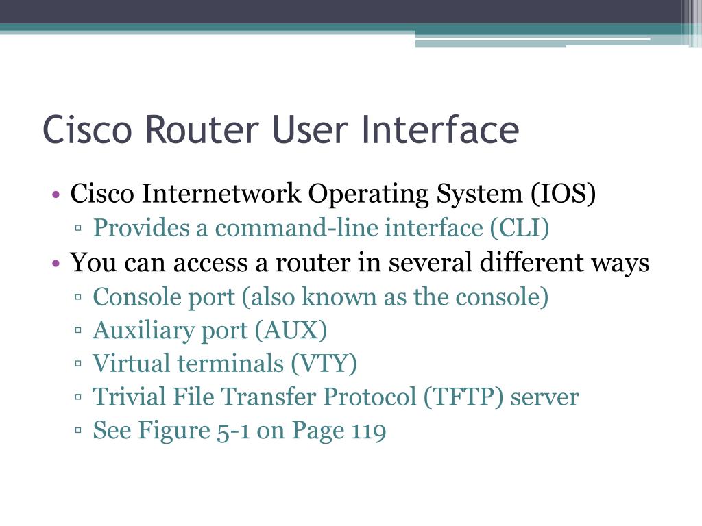 Cisco Router User Interface • Cisco Internetwork Operating System (IOS) • Provides a command-line interface (CLI) • You can access a router in several different ways • Console port (also known as the console) • Auxiliary port (AUX) • Virtual terminals (VTY) • Trivial File Transfer Protocol (TFTP) server • See Figure 5-1 on Page 119