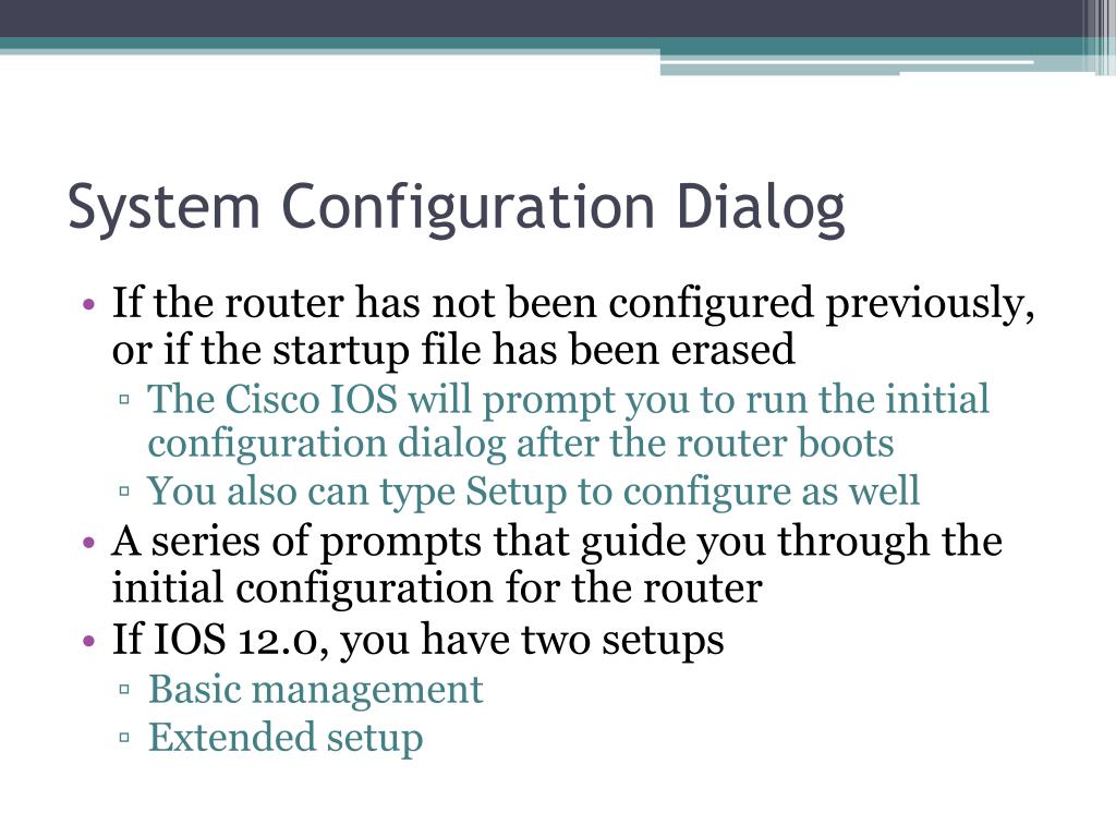 System Configuration Dialog • If the router has not been configured previously, or if the startup file has been erased • The Cisco IOS will prompt you to run the initial configuration dialog after the router boots • You also can type Setup to configure as well • A series of prompts that guide you through the initial configuration for the router • If IOS 12.0, you have two setups • Basic management • Extended setup