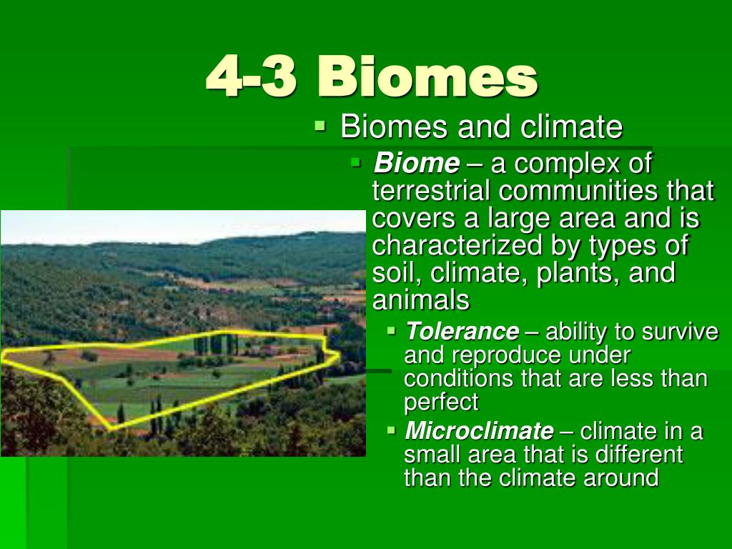 4-3 Biomes • Biomes and climate • Biome – a complex of terrestrial communities that covers a large area and is characterized by types of soil, climate, plants, and animals • Tolerance – ability to survive and reproduce under conditions that are less than perfect • Microclimate – climate in a small area that is different than the climate around