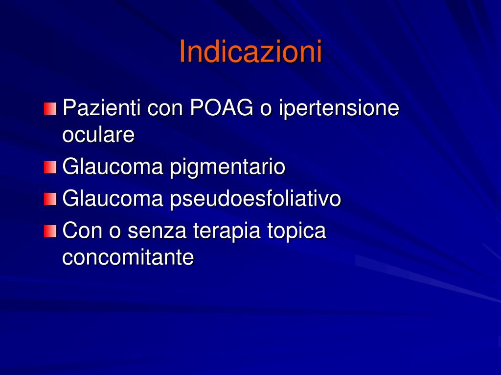 Indicazioni • Pazienti con POAG o ipertensione oculare • Glaucoma pigmentario • Glaucoma pseudoesfoliativo • Con o senza terapia topica concomitante