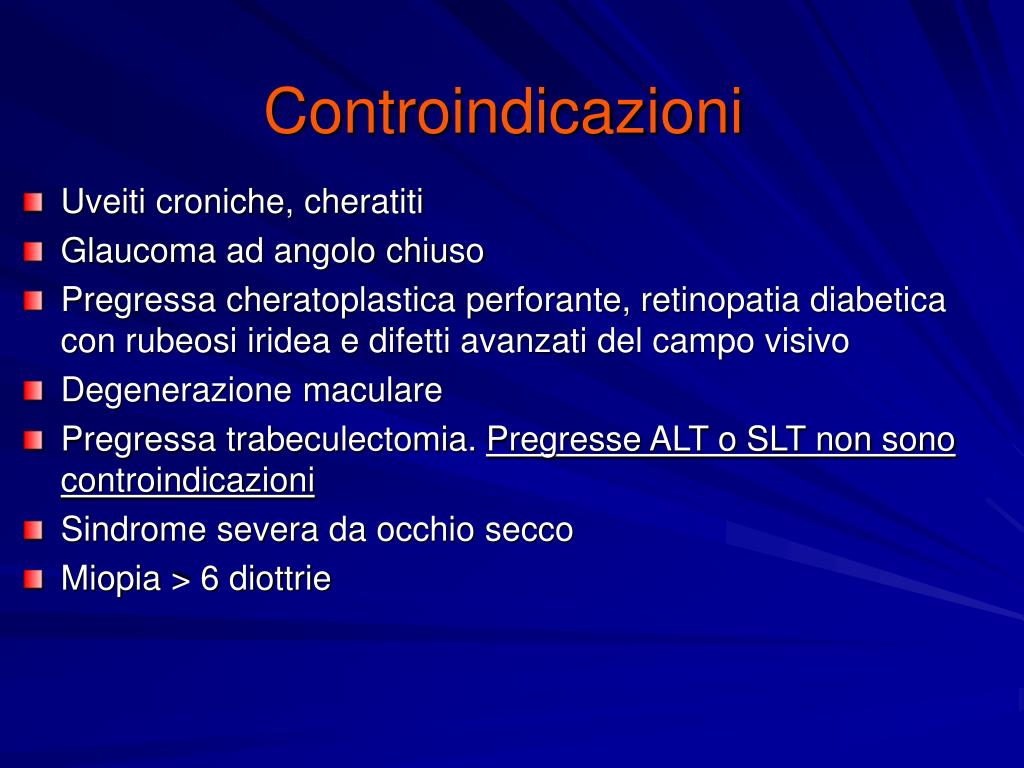 Controindicazioni • Uveiti croniche, cheratiti • Glaucoma ad angolo chiuso • Pregressa cheratoplastica perforante, retinopatia diabetica con rubeosi iridea e difetti avanzati del campo visivo • Degenerazione maculare • Pregressa trabeculectomia. Pregresse ALT o SLT non sono controindicazioni • Sindrome severa da occhio secco • Miopia > 6 diottrie