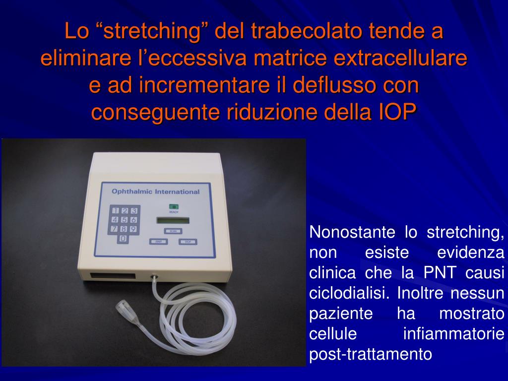 Lo “stretching” del trabecolato tende a eliminare l’eccessiva matrice extracellulare e ad incrementare il deflusso con conseguente riduzione della IOP Nonostante lo stretching, non esiste evidenza clinica che la PNT causi ciclodialisi. Inoltre nessun paziente ha mostrato cellule infiammatorie post-trattamento