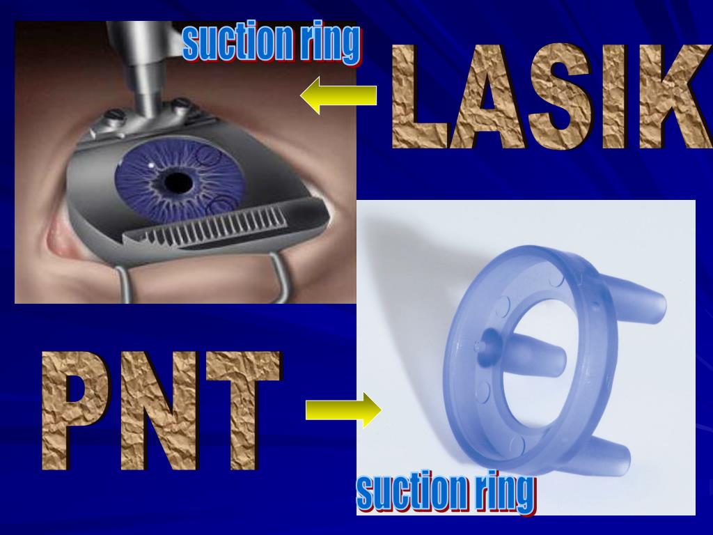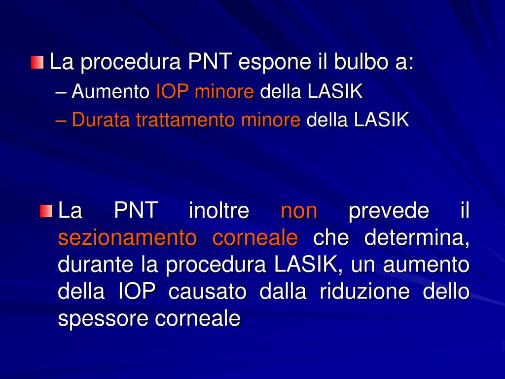 La procedura PNT espone il bulbo a: • Aumento IOP minore della LASIK • Durata trattamento minore della LASIK • La PNT inoltre non prevede il sezionamento corneale che determina, durante la procedura LASIK, un aumento della IOP causato dalla riduzione dello spessore corneale
