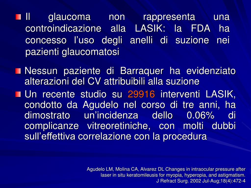 Il glaucoma non rappresenta una controindicazione alla LASIK: la FDA ha concesso l’uso degli anelli di suzione nei pazienti glaucomatosi • Nessun paziente di Barraquer ha evidenziato alterazioni del CV attribuibili alla suzione • Un recente studio su 29916 interventi LASIK, condotto da Agudelo nel corso di tre anni, ha dimostrato un’incidenza dello 0.06% di complicanze vitreoretiniche, con molti dubbi sull’effettiva correlazione con la procedura Agudelo LM, Molina CA, Alvarez DLChanges in intraocular pressure after laser in situ keratomileusis for myopia, hyperopia, and astigmatism.J Refract Surg. 2002 Jul-Aug;18(4):472-4