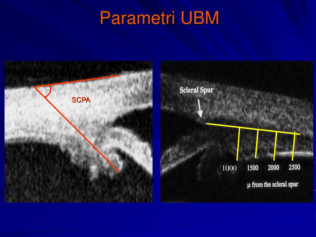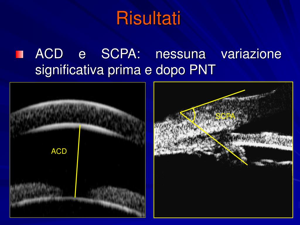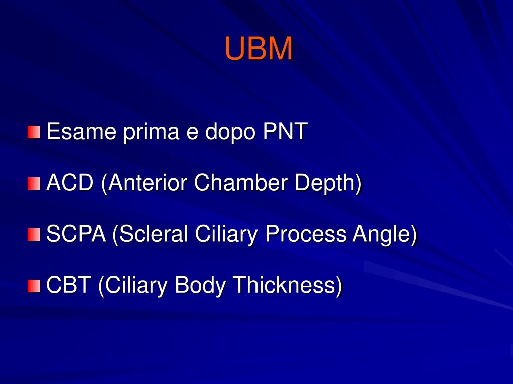 UBM • Esame prima e dopo PNT • ACD (Anterior Chamber Depth) • SCPA (Scleral Ciliary Process Angle) • CBT (Ciliary Body Thickness)