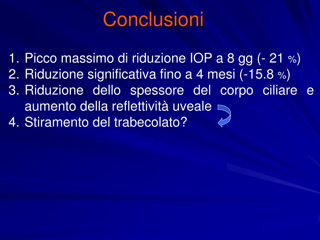 Conclusioni • Picco massimo di riduzione IOP a 8 gg (- 21 %) • Riduzione significativa fino a 4 mesi (-15.8 %) • Riduzione dello spessore del corpo ciliare e aumento della reflettività uveale • Stiramento del trabecolato?
