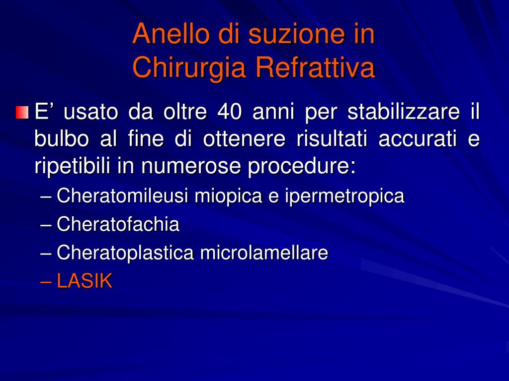 Anello di suzione inChirurgia Refrattiva • E’ usato da oltre 40 anni per stabilizzare il bulbo al fine di ottenere risultati accurati e ripetibili in numerose procedure: • Cheratomileusi miopica e ipermetropica • Cheratofachia • Cheratoplastica microlamellare • LASIK