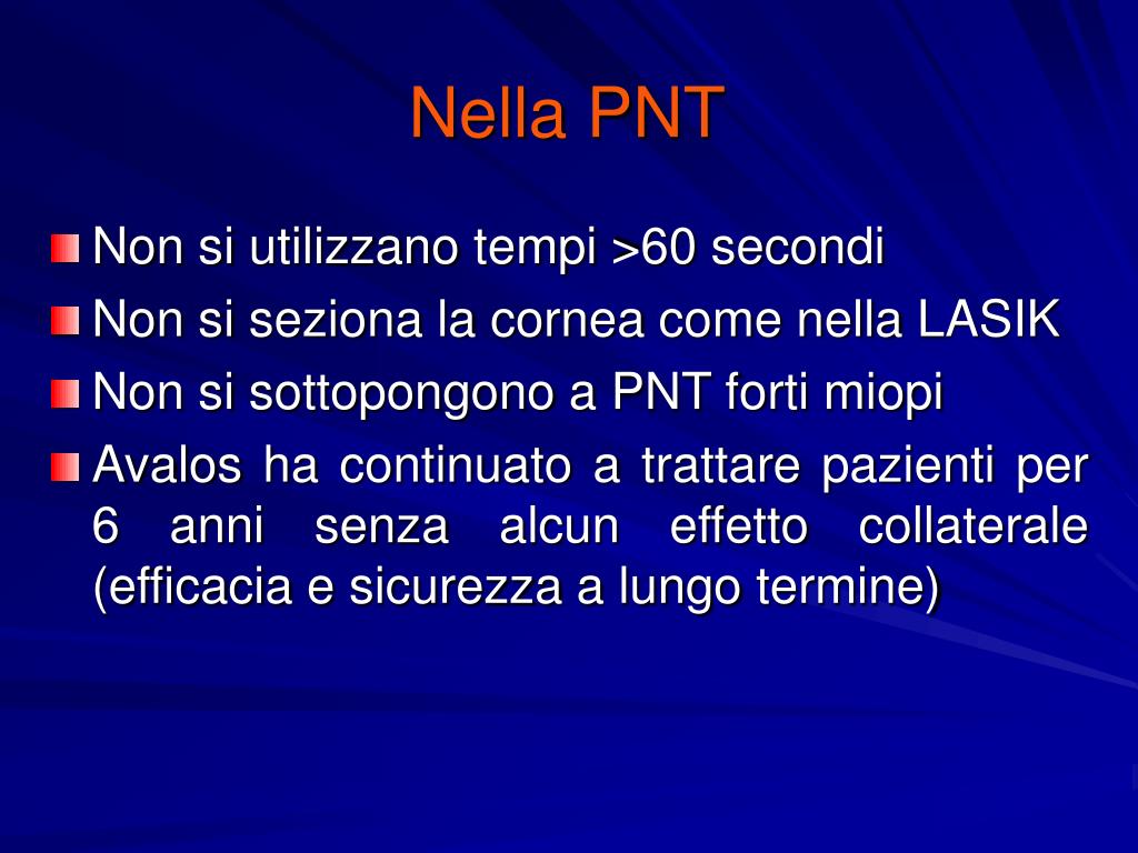 Nella PNT • Non si utilizzano tempi >60 secondi • Non si seziona la cornea come nella LASIK • Non si sottopongono a PNT forti miopi • Avalos ha continuato a trattare pazienti per 6 anni senza alcun effetto collaterale (efficacia e sicurezza a lungo termine)