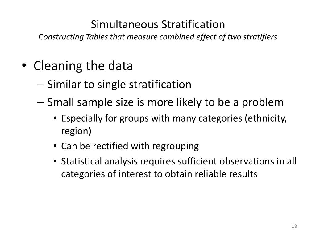 Simultaneous StratificationConstructing Tables that measure combined effect of two stratifiers • Cleaning the data • Similar to single stratification • Small sample size is more likely to be a problem • Especially for groups with many categories (ethnicity, region) • Can be rectified with regrouping • Statistical analysis requires sufficient observations in all categories of interest to obtain reliable results
