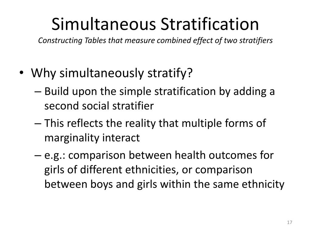 Simultaneous StratificationConstructing Tables that measure combined effect of two stratifiers • Why simultaneously stratify? • Build upon the simple stratification by adding a second social stratifier • This reflects the reality that multiple forms of marginality interact • e.g.: comparison between health outcomes for girls of different ethnicities, or comparison between boys and girls within the same ethnicity