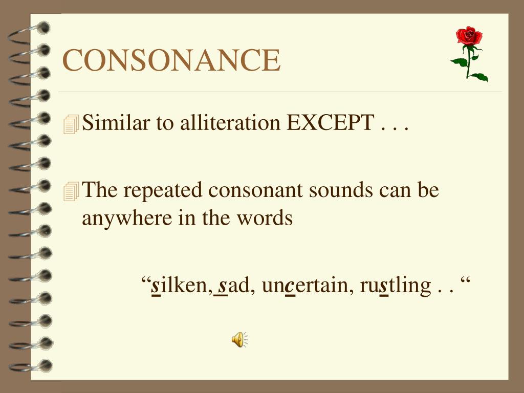 CONSONANCE • Similar to alliteration EXCEPT . . . • The repeated consonant sounds can be anywhere in the words • “silken,sad, uncertain, rustling . . “