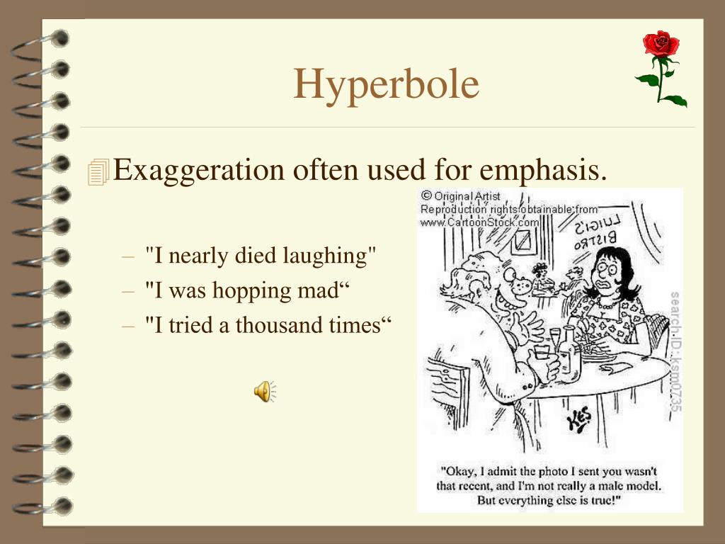 Hyperbole • Exaggeration often used for emphasis. • "I nearly died laughing" • "I was hopping mad“ • "I tried a thousand times“