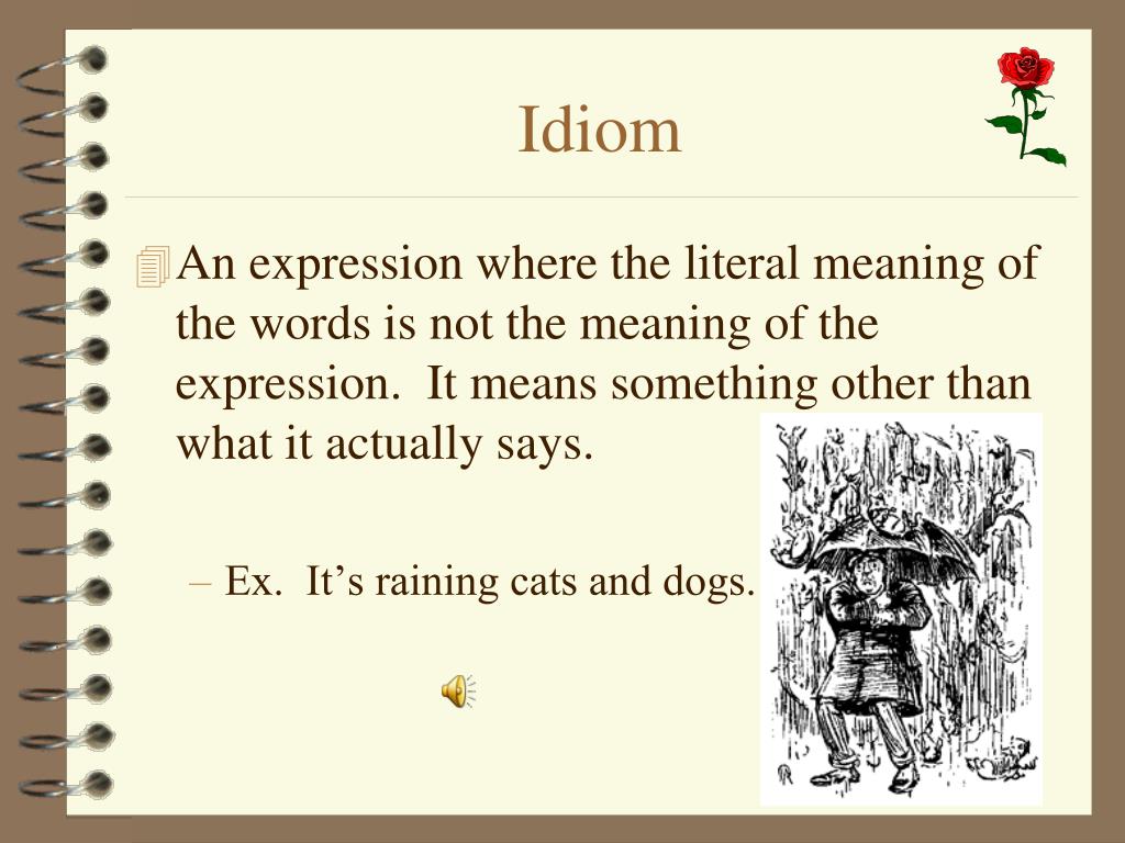 Idiom • An expression where the literal meaning of the words is not the meaning of the expression. It means something other than what it actually says. • Ex. It’s raining cats and dogs.