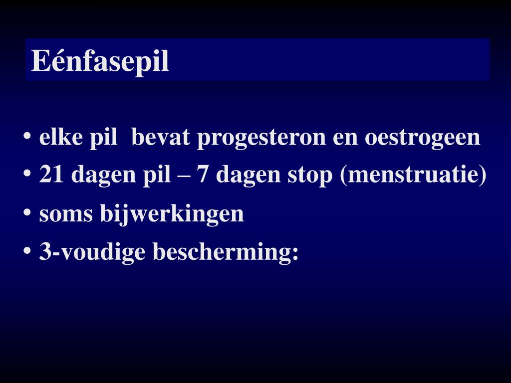 Eénfasepil • elke pil bevat progesteron en oestrogeen • 21 dagen pil – 7 dagen stop (menstruatie) • soms bijwerkingen • 3-voudige bescherming: