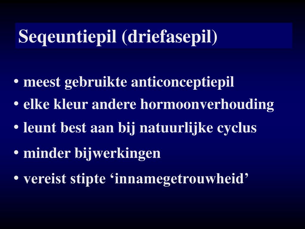 Seqeuntiepil (driefasepil) • meest gebruikte anticonceptiepil • elke kleur andere hormoonverhouding • leunt best aan bij natuurlijke cyclus • minder bijwerkingen • vereist stipte ‘innamegetrouwheid’