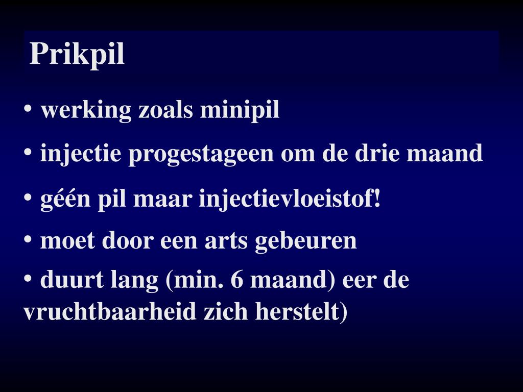 Prikpil • werking zoals minipil • injectie progestageen om de drie maand • géén pil maar injectievloeistof! • moet door een arts gebeuren • duurt lang (min. 6 maand) eer de vruchtbaarheid zich herstelt)