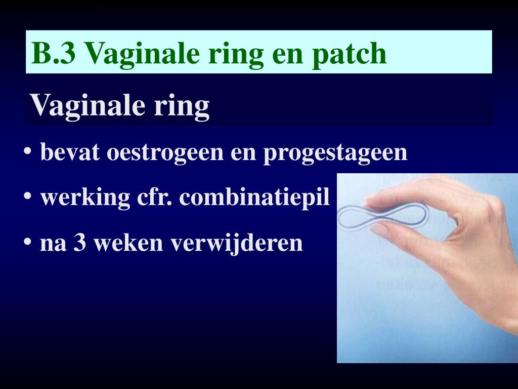 B.3 Vaginale ring en patch Vaginale ring • bevat oestrogeen en progestageen • werking cfr. combinatiepil • na 3 weken verwijderen