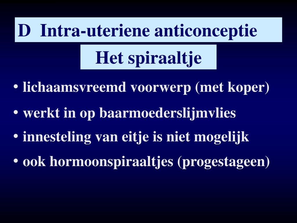 D Intra-uteriene anticonceptie Het spiraaltje • lichaamsvreemd voorwerp (met koper) • werkt in op baarmoederslijmvlies • innesteling van eitje is niet mogelijk • ook hormoonspiraaltjes (progestageen)