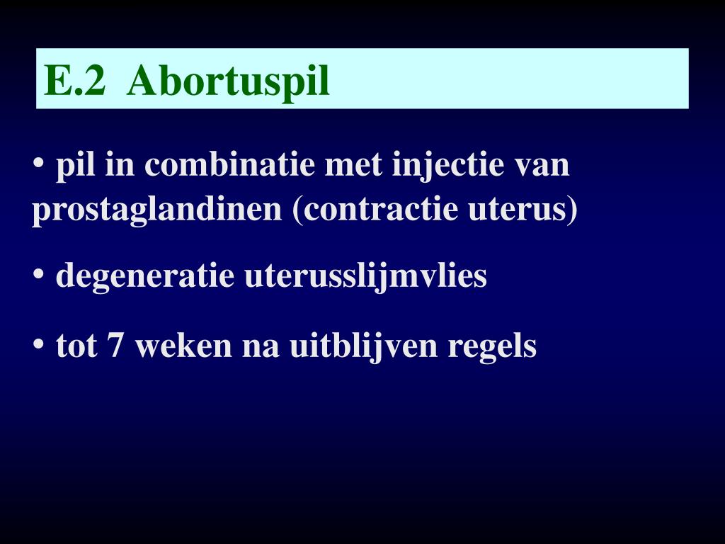 E.2 Abortuspil • pil in combinatie met injectie van prostaglandinen (contractie uterus) • degeneratie uterusslijmvlies • tot 7 weken na uitblijven regels