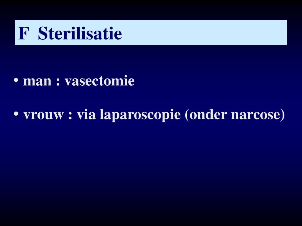 F Sterilisatie • man : vasectomie • vrouw : via laparoscopie (onder narcose)