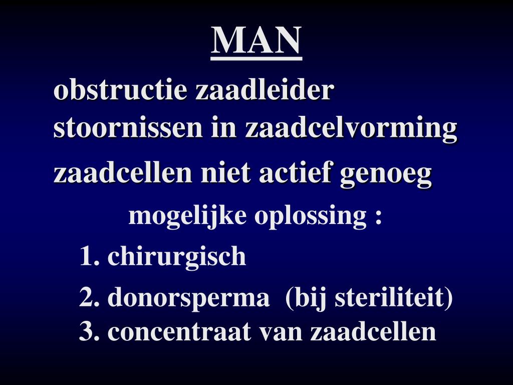 MAN obstructie zaadleider stoornissen in zaadcelvorming zaadcellen niet actief genoeg mogelijke oplossing : 1. chirurgisch 2. donorsperma (bij steriliteit) 3. concentraat van zaadcellen