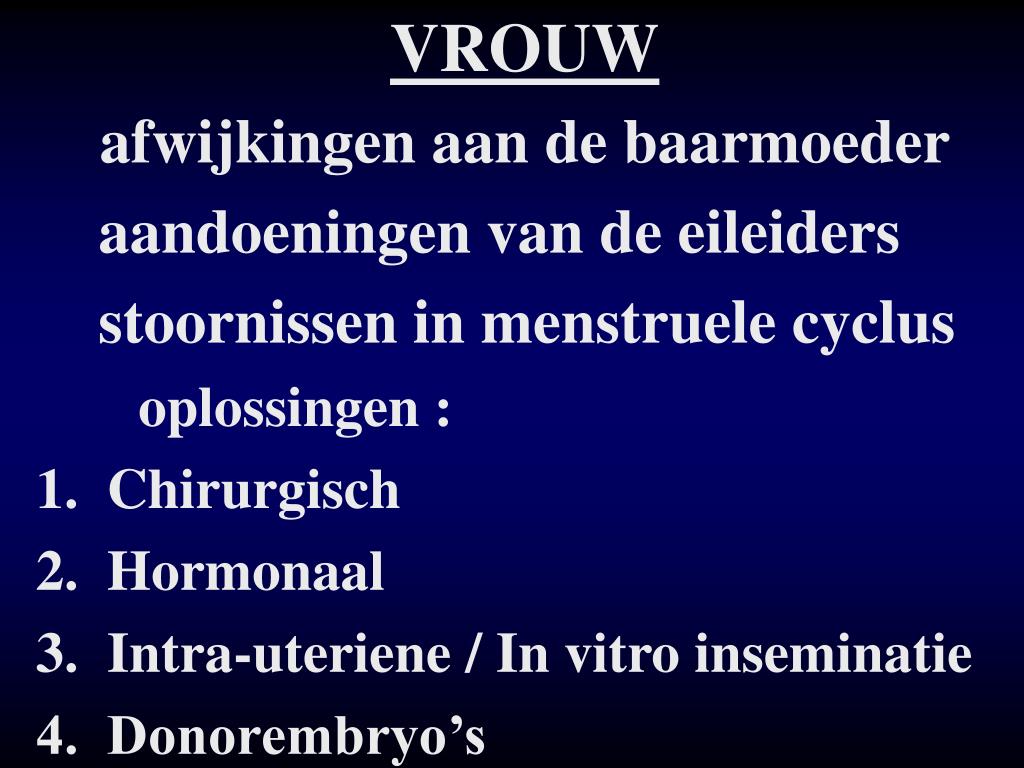 VROUW afwijkingen aan de baarmoeder aandoeningen van de eileiders stoornissen in menstruele cyclus oplossingen : 1. Chirurgisch 2. Hormonaal 3. Intra-uteriene / In vitro inseminatie 4. Donorembryo’s